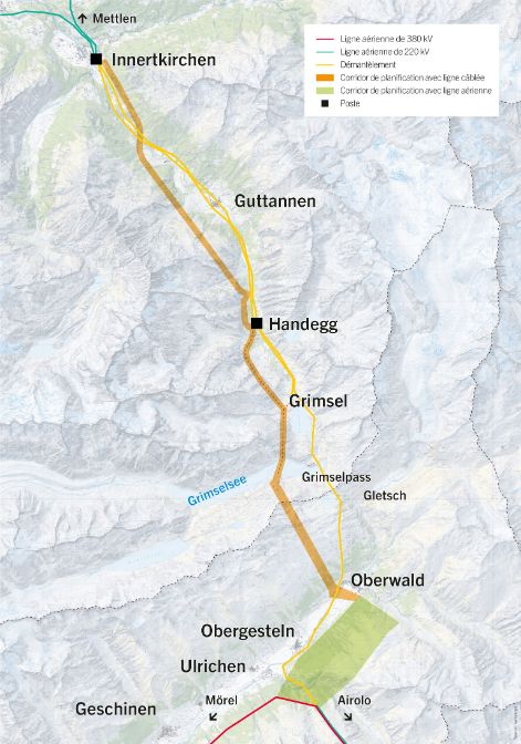 Le 25 février 2023, le Conseil fédéral a inscrit dans le plan sectoriel le corridor de planification avec une grande ligne câblée souterraine sur environ 23 km entre Innertkirchen et Oberwald. Dans les deux variantes, la ligne passe sous le fond de la vallée à Oberwald sous forme de ligne câblée souterraine et se prolonge jusqu’à Ulrichen sous forme de corridor de lignes aériennes. Il existe deux variantes pour la ligne câblée souterraine d’environ 23 kilomètres entre Innertkirchen et Oberwald.