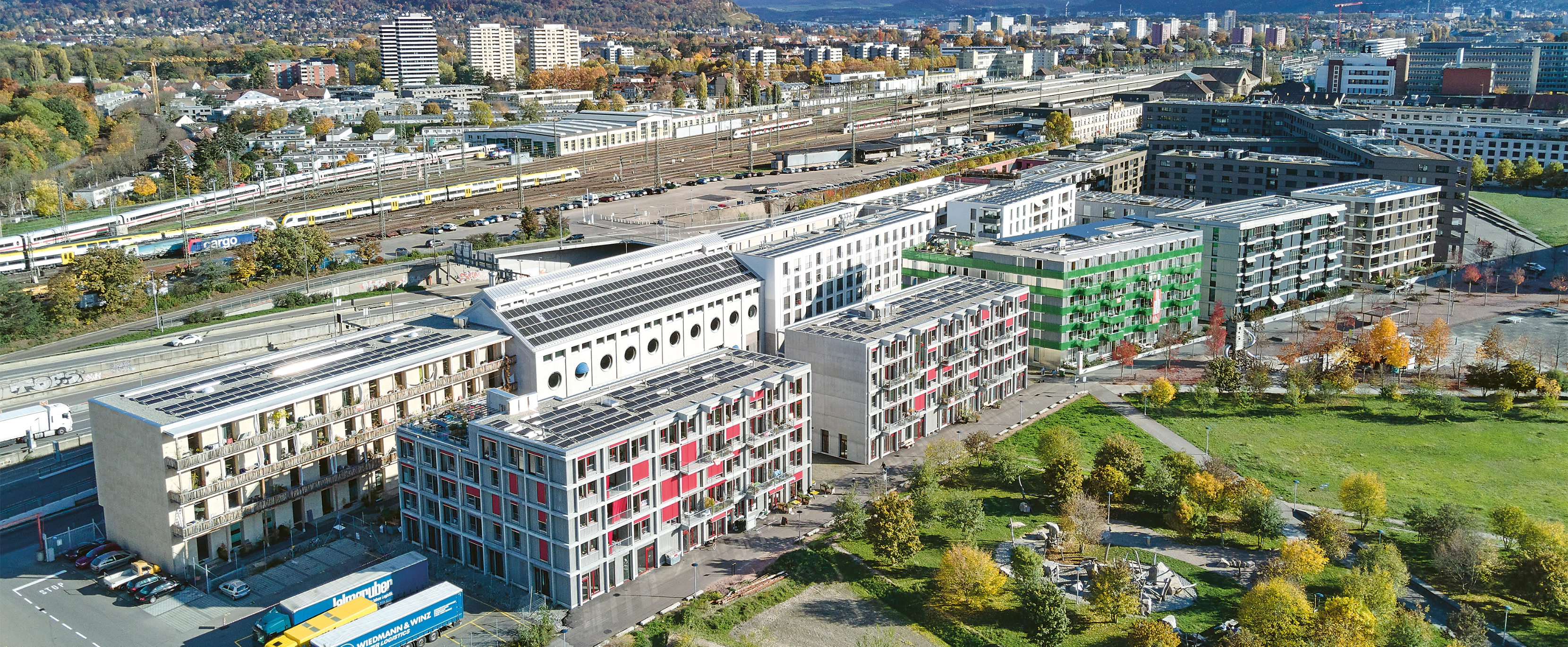 Sämtliche Dächer sind mit Photovoltaikanlagen ausgestattet. Das ist Pflicht, damit die Energiezentrale optimal betrieben werden kann. Im Sommer deckt das Areal seinen Strombedarf tagsüber oft vollständig selbst. Darüber hinaus sind drei Wärmepumpen mit einem Heizspeicher von 70m3 installiert. Diese Konfiguration ermöglicht es, Wärme zu erzeugen, wenn der Solarstrom verfügbar ist. Überschüsse füllen die Warmwasser-Pufferspeicher. Was darüber hinausgeht, wird ins Netz gespiesen. Insgesamt erreichen wir so einen Eigenverbrauch von über 80%.