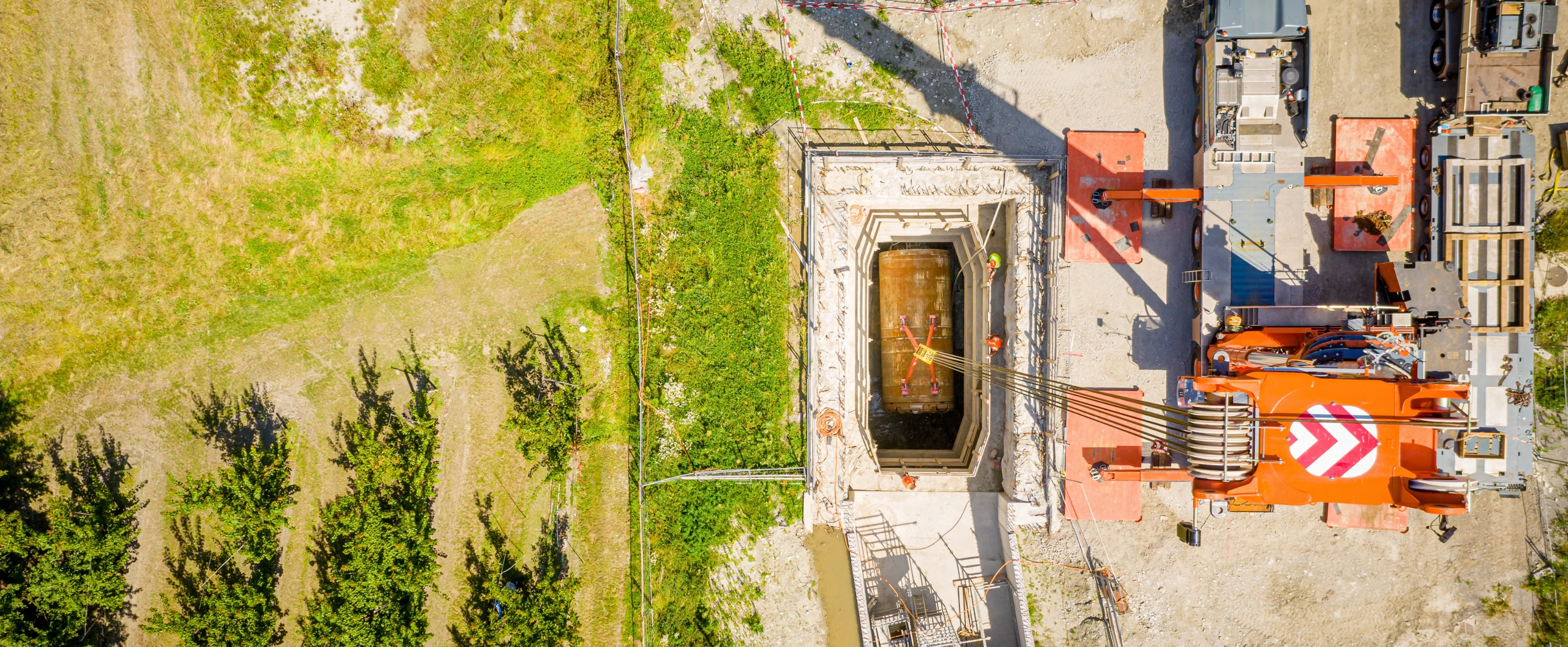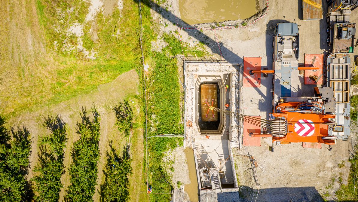 Die Mini-Tunnelbohrmaschine Giorgia wurde am 12. August 2021 beim Unterwerk von La Bâtiaz wieder an die Erdoberfläche gebracht. Sie wird anschliessend vom Hersteller für ihre nächsten Einsätze auf anderen Baustellen instandgesetzt.