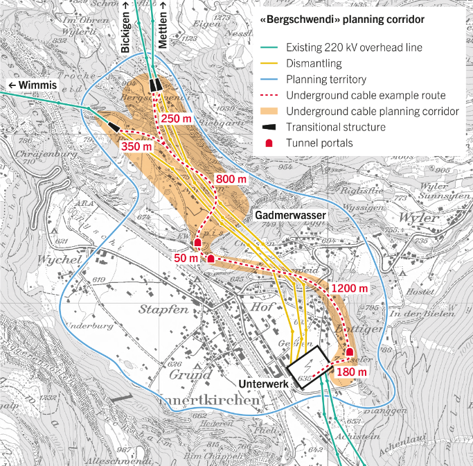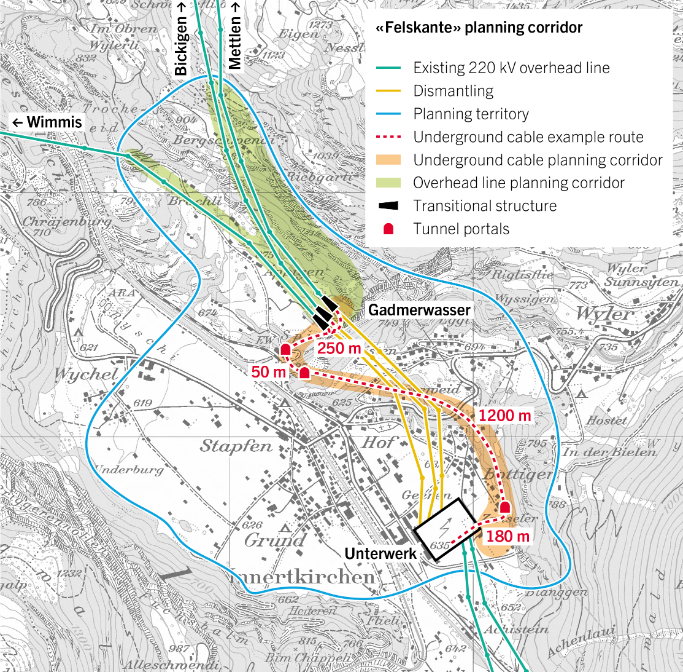 - «Long cabling» variant: The corridor runs underground from Innertkirchen to Obergoms – either in a newly constructed tunnel until Handegg and, from there, in largely existing tunnels as per version 2, or in the multi-functional Grimselbahn tunnel, which leads from Innertkirchen to Oberwald. Corridor options as an overhead line or underground cable are then possible between Oberwald and Ulrichen.