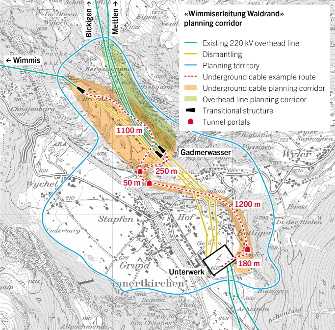 - «Overhead line» variant: The overhead line corridor runs along the valley floor between Innertkirchen and Handegg. From Handegg to east of Oberwald it passes through high-Alpine terrain. On the Valais side of the Grimsel Pass, the corridor crosses Obergoms near St. Niklaus and leads along the southern flank of the valley to Ulrichen.