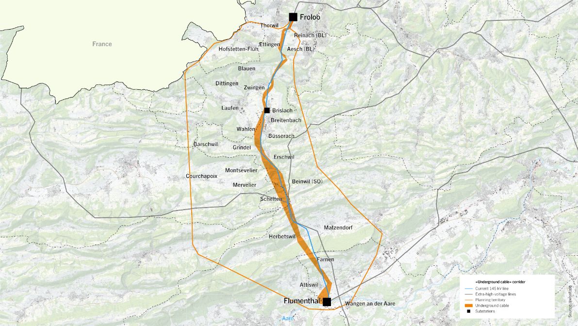 The planning area stretches from Flumenthal (canton of Solothurn) north over the Weissenstein and Schelten mountains to the Laufen basin as far as the substation in Brislach (Laufen district, canton of Basel-Landschaft), which will be connected to the new line. The line will continue from the substation in Brislach via the Blauen mountain range to Therwil (canton of Basel-Landschaft), the municipality where the Froloo substation is located.
