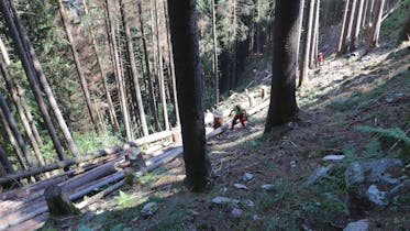 Sepp arrête la tronçonneuse, relève la visière et essuie la sueur ruisselant sur son front du dos de la main. Le terrain est raide, le travail fatigant et dangereux. Sepp travaille pour l'entreprise forestière Uri Süd. Il abat les arbres attaqués par les scolytes au-dessus de Gurtnellen, dans le canton d’Uri, en collaboration avec Swissgrid. Ce travail est indispensable en raison de l’infestation qui sévit. Il vient d’en ébrancher un et a de nouveau escaladé le chemin. Ses deux collègues étant en train d’abattre l’arbre suivant, il doit bloquer le chemin pour des raisons de sécurité et arrêter les éventuels randonneurs.