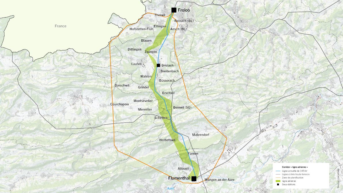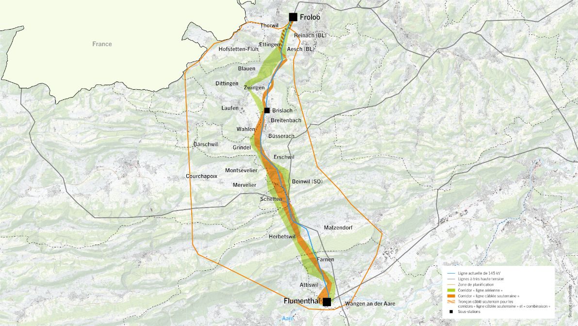 La zone de planification s’étend de Flumenthal (SO) vers le nord, en passant par les chaînes de montagnes du Weissenstein et du Schelten, jusqu’au bassin de Laufon et à la sous-station de Brislach (district de Laufon, BL), qui sera raccordée à la nouvelle ligne. De la sous-station de Brislach, elle se poursuit via la chaîne de montagnes du Blauen jusqu’à Therwil (BL), la commune d’implantation de la sous-station de Froloo.