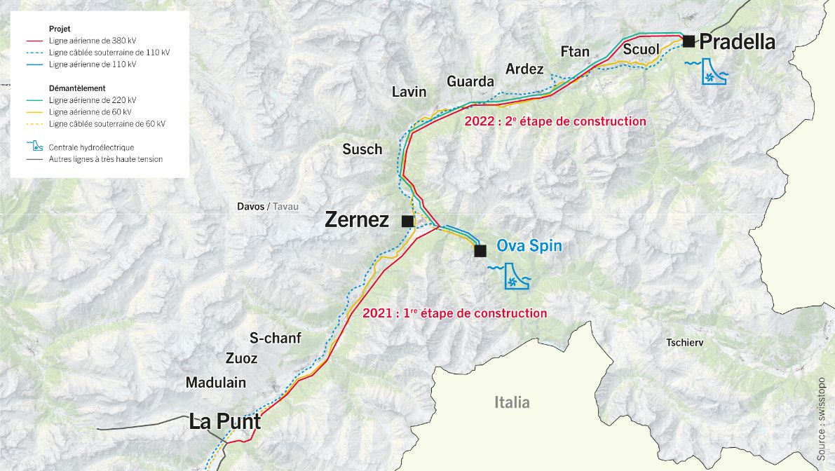Depuis le 11 novembre 2022, du courant circule sur la ligne à très haute tension étendue entre Pradella et La Punt. Cela permettra d’éliminer une congestion dans le réseau de transport suisse. La ligne Pradella – La Punt est importante pour la sécurité d’approvisionnement du canton des Grisons et de toute la Suisse. En guise de mesure de substitution du projet, 1100 pylônes de réseau de distribution ont été démontés en Engadine.