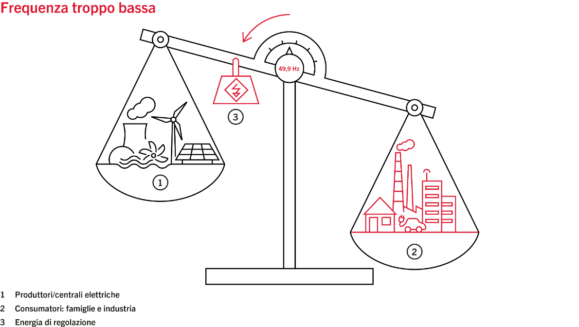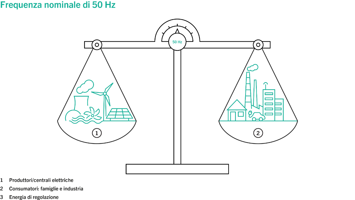 Cosa hanno in comune la salute, il lavoro, le finanze e la rete ad altissima tensione? La necessità di mantenere un equilibrio nella loro gestione per poterne trarre benefici. Nella rete Swissgrid, questo equilibrio si ottiene tenendo costante la frequenza del sistema a 50 Hertz. Se il consumo è inferiore alla produzione, la frequenza è maggiore; viceversa, se il consumo è superiore alla produzione, la frequenza è minore.