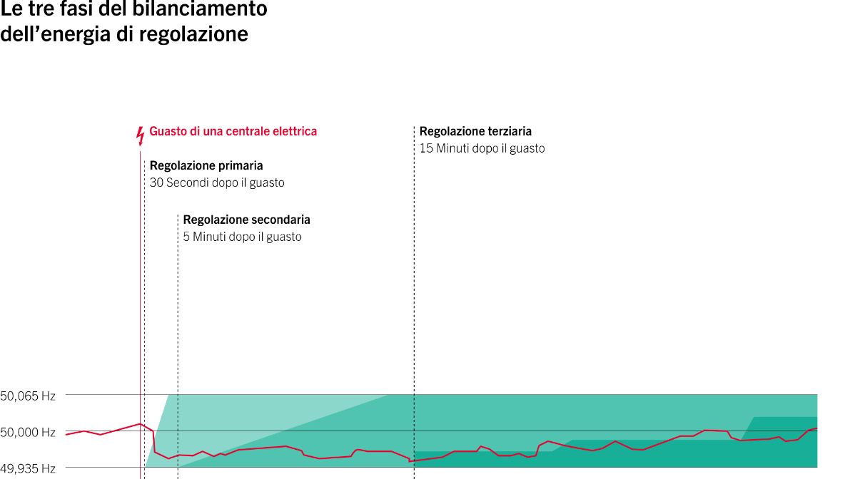 Può poi verificarsi il caso in cui una centrale elettrica si guasta e Swissgrid è costretta a chiedere ad altre unità di produzione di energia elettrica di aumentare la loro produzione per ripristinare l’equilibrio e mantenere la frequenza del sistema a 50 Hertz.