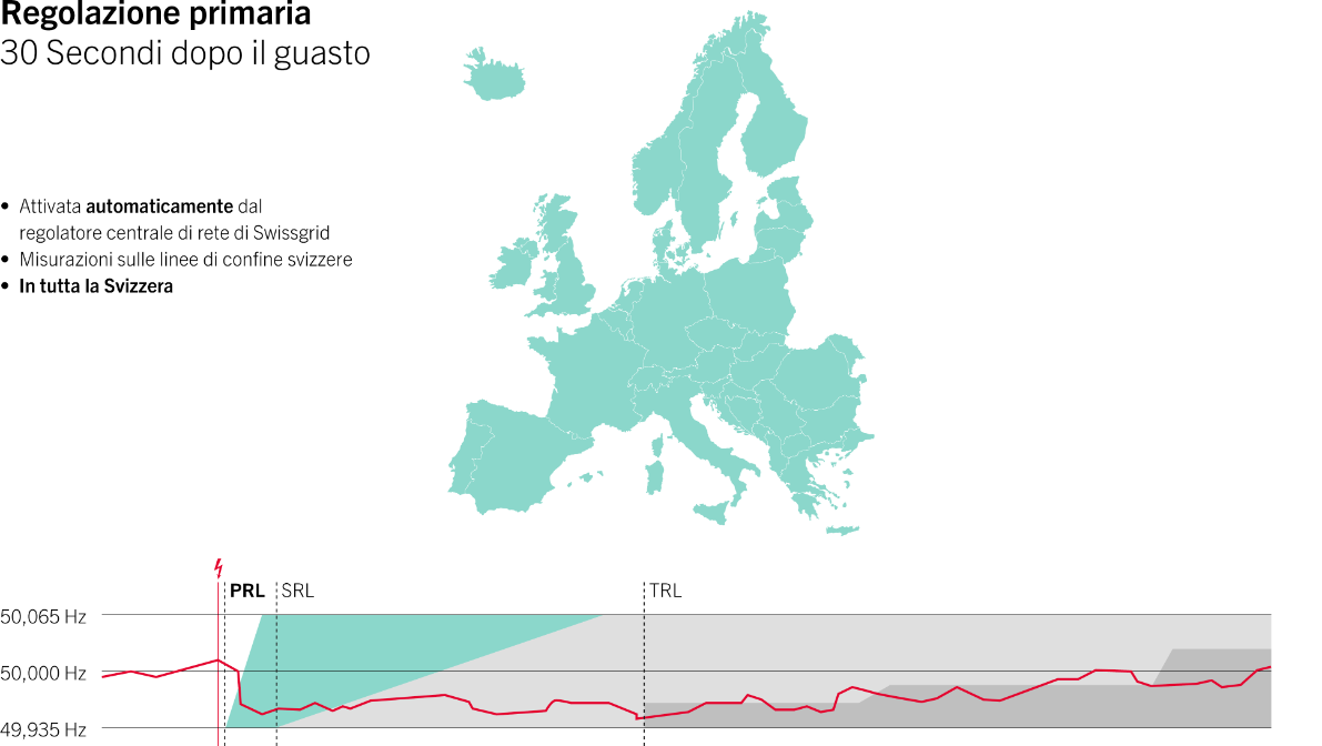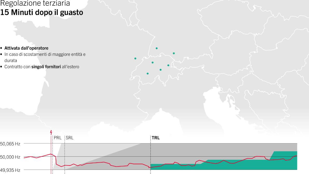 - L'energia di regolazione primaria viene attivata automaticamente trenta secondi dopo il rilevamento di una deviazione di frequenza. Le centrali elettriche sono configurate per reagire in maniera automatica e immediata a qualsiasi variazione della frequenza del sistema. In base al consumo, aumentano o riducono autonomamente la loro potenza. Questo sistema funziona come il regolatore di velocità di un’automobile.