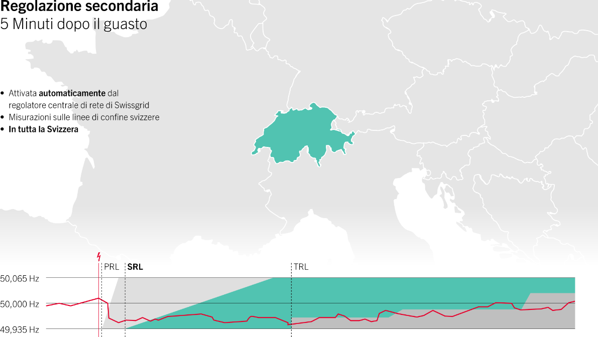 - L'energia di regolazione secondaria subentra dopo 5 minuti. Anche l’attivazione di questa energia è automatica. La potenza viene fornita da centrali elettriche alle quali Swissgrid invia automaticamente un segnale.