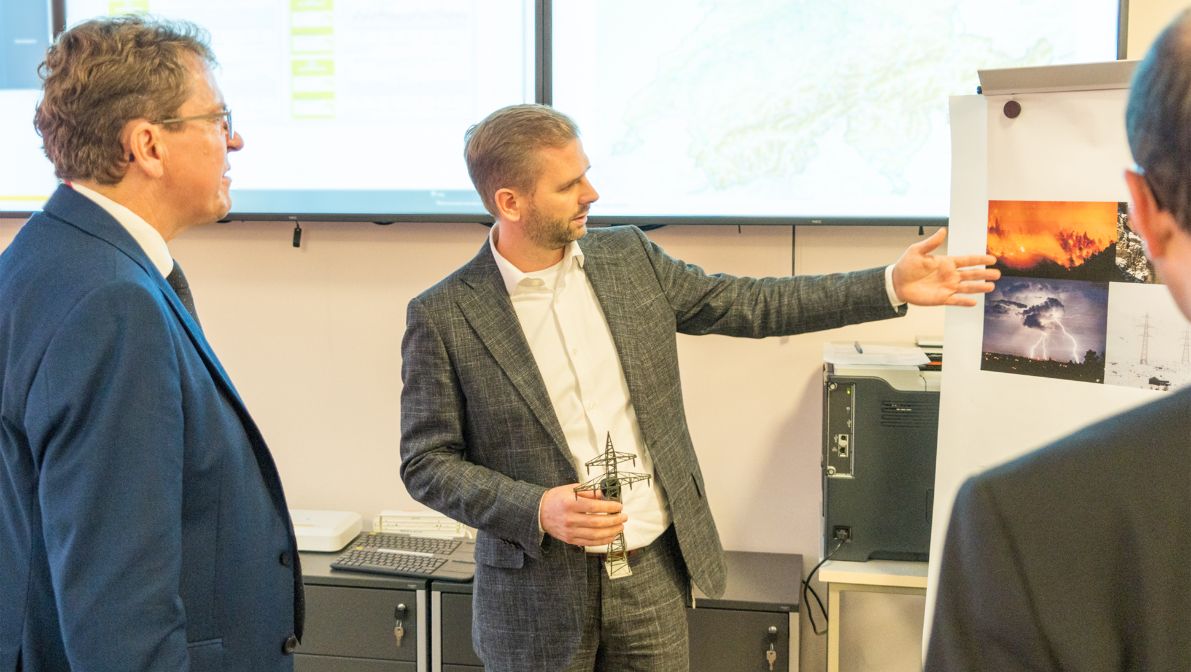 Oltre alla digitalizzazione, Swissgrid si concentra anche sullo sviluppo e sull’implementazione di soluzioni innovative. Per questo motivo, durante la visita del Consigliere federale Rösti non poteva mancare una visita alla nostra divisione di Ricerca e digitalizzazione (R&D) con il responsabile Matthias Bucher. L’innovazione e la digitalizzazione sono in prima linea quando si tratta di creare le condizioni necessarie per l’auspicata trasformazione digitale dell’azienda. Matthias Bucher ha potuto presentare al Consigliere federale uno dei nostri progetti in corso, «Pylonian» (monitoraggio dei tralicci elettrici mediante sensori IoT). «L’obiettivo di Pylonian è quello di tenere sotto controllo le condizioni dei tralicci durante il loro intero ciclo di vita, in modo da poter riconoscere il più precocemente possibile i danni strutturali ed eseguire tempestivamente gli interventi di manutenzione necessari», ha spiegato Matthias Bucher.