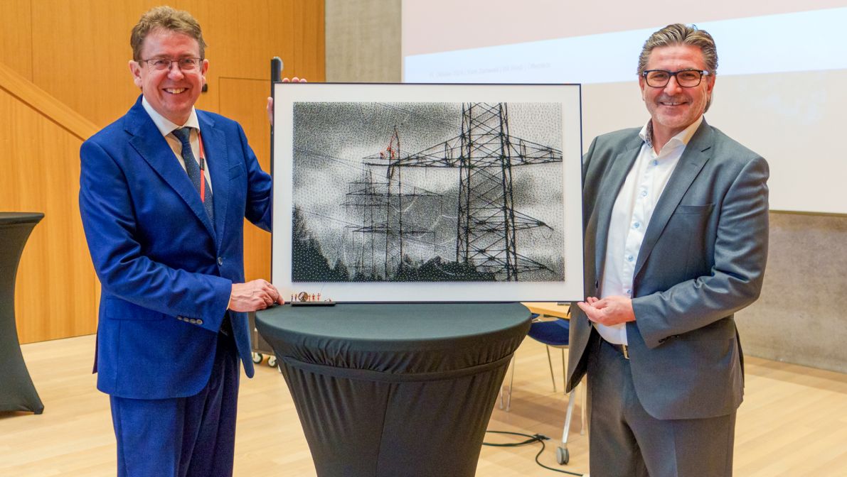 Il CEO Yves Zumwald ha regalato al Consigliere federale Rösti un’opera realizzata dal Grid Maintenance Manager Flurin Bergamin. Il suo lavoro presso Swissgrid lo ha ispirato a creare un’opera d’arte che raffigura dei tralicci realizzati con la String Art, un segno del forte coinvolgimento dei collaboratori e delle collaboratrici di Swissgrid. Ci auguriamo che l’opera trovi un posto di rilievo a Berna e che ricordi sempre al personale dell’Amministrazione federale quanto sia importante la rete elettrica per l’attuazione di una transizione energetica di successo.
