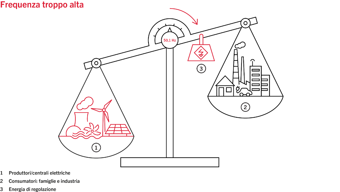 Dopo essere stata prodotta, l’elettricità viene immessa nella rete ad altissima tensione gestita da Swissgrid. Per garantire un esercizio sicuro e stabile, la produzione e il consumo di elettricità devono essere sempre in equilibrio. In caso di oscillazioni, Swissgrid utilizza l’energia di regolazione. Quest’ultima rappresenta una riserva da cui l’elettricità può essere immessa nella rete o prelevata, a seconda della situazione.
