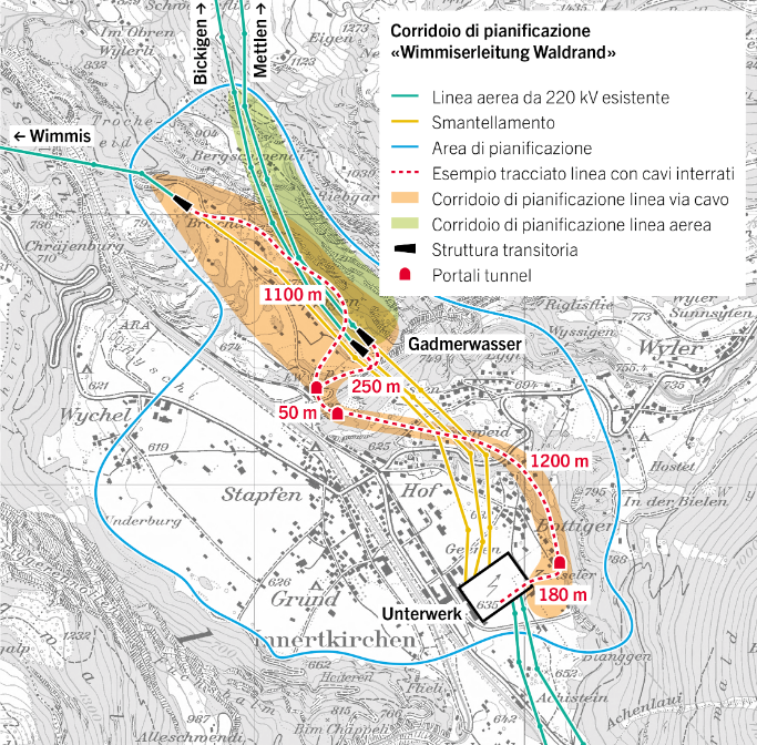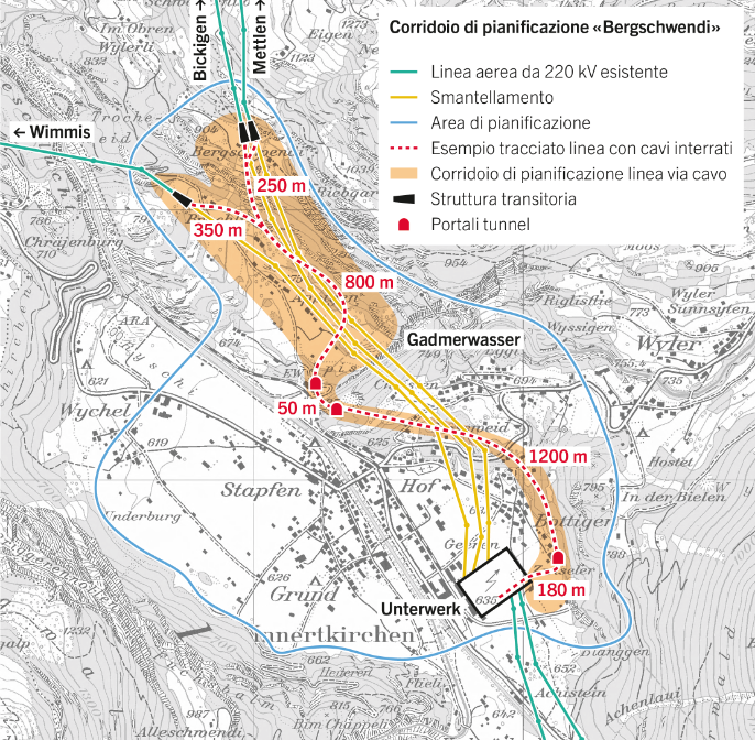 - Variante «Cablaggio interrato lungo»: il corridoio corre nel sottosuolo da Innertkirchen fino all'Obergoms – in una galleria che dovrà essere costruita fino a Handegg e poi in gallerie in gran parte già esistenti oppure nel tunnel multifunzionale del Grimsel che va da Innertkirchen a Oberwald. Tra Oberwald e Ulrichen sono possibili varianti di corridoio sia con linee aeree sia con cavi interrati.