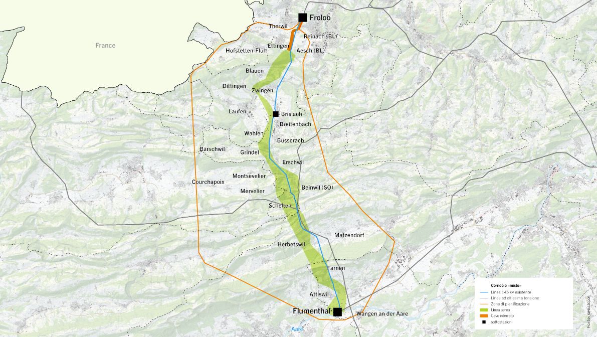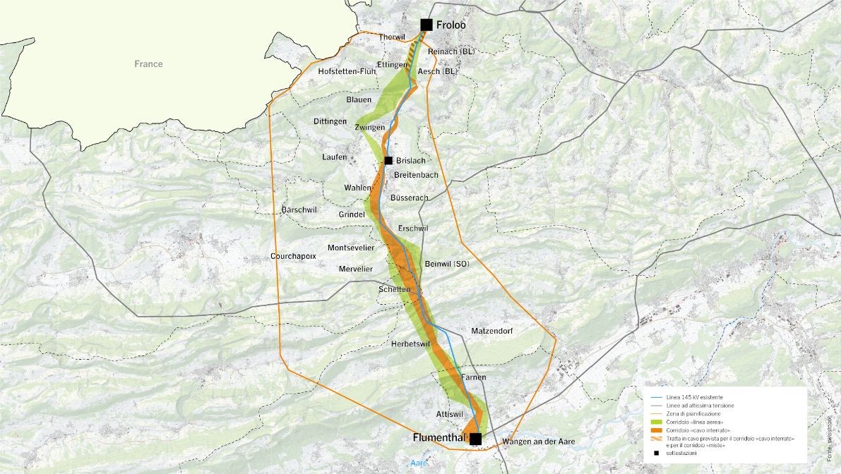 Il corridoio di linea aerea è il corridoio selezionato stabilito. È posizionato in modo tale che l’impatto sui villaggi dell’area sia il minore possibile e che le relative aree di insediamento rimangano intatte. Nel corso dell’ulteriore pianificazione, si dovrà fare attenzione a garantire che il tracciato di linea sia il più possibile rispettoso del paesaggio, tenendo conto in particolare della protezione delle acque sotterranee e degli interessi dello sviluppo del territorio. La linea esistente da 145 kV, che passa vicino ad alcuni villaggi, sarà smantellata, riducendo così in modo significativo l’impatto sull’area residenziale, in particolare ai piedi del Giura e nel bacino di Laufen, che potrà essere pertanto potenziata.