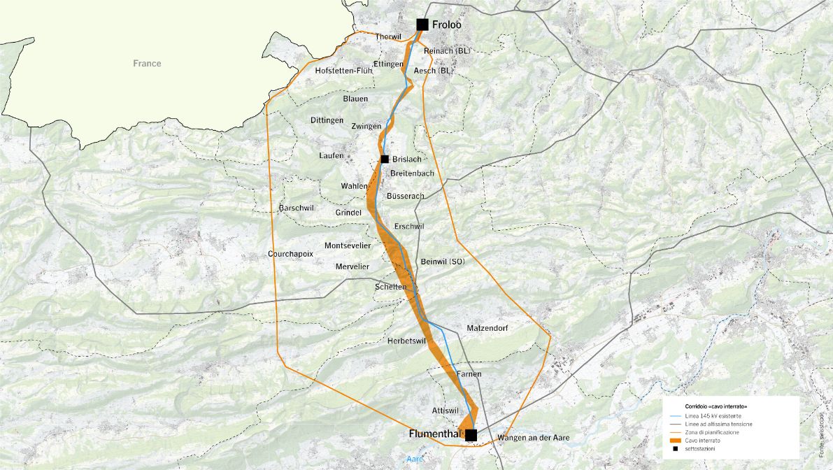 L’area di pianificazione va da Flumenthal (SO) verso nord, attraverso le catene montuose di Weissenstein e Schelten, fino al bacino di Laufen e alla sottostazione di Brislach (distretto di Laufen, BL), che sarà collegata alla nuova linea. Dalla sottostazione di Brislach, prosegue attraverso la catena montuosa di Blauen fino a Therwil (BL), dove si trova la sottostazione di Froloo.