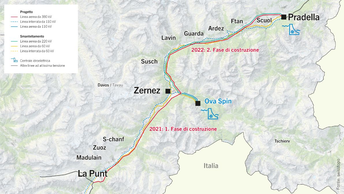 Dall’11 novembre 2022 la corrente elettrica attraversa la linea ad altissima tensione ampliata tra Pradella e La Punt. In questo modo si risolve una congestione nella rete svizzera di trasmissione. La linea Pradella – La Punt è importante per la sicurezza dell’approvvigionamento del Canton Grigioni e di tutta la Svizzera. Come misura sostitutiva del progetto, in Engadina sono stati smantellati 1100 tralicci della rete di distribuzione.